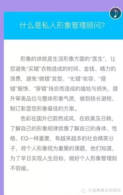 随着前几天成都90后美女整理衣橱月薪过万的新闻报道后,私人形象管理顾问课程越来越受到大家的喜爱,那么大连昊昊化妆做为东北******推出私人形象顾问管理课程的 ,收到广大顾客的喜爱,越来越多的人关注到私人形象管理顾问的重要性,课程时间短,见效快,在***短时间内把***精湛的技术教得大家,想学的你赶快报名吧!报名热线:15040444077