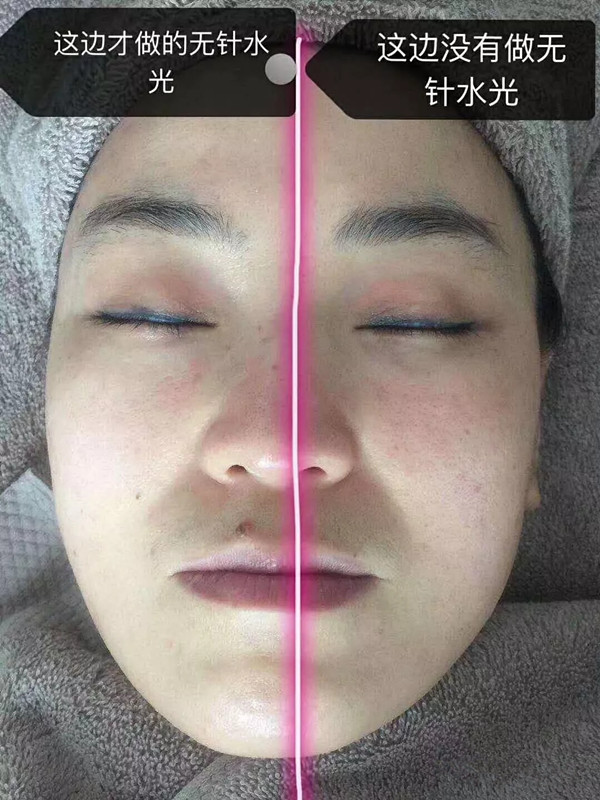 二 无针水光 :一次无针水光相当于8000次面膜,无针水光是通过仪器产生的气压将应用物质输送到真皮层,整个过程仪器不会接触到皮肤,因此不会产生疼痛感,相比有针水光安全性更高。